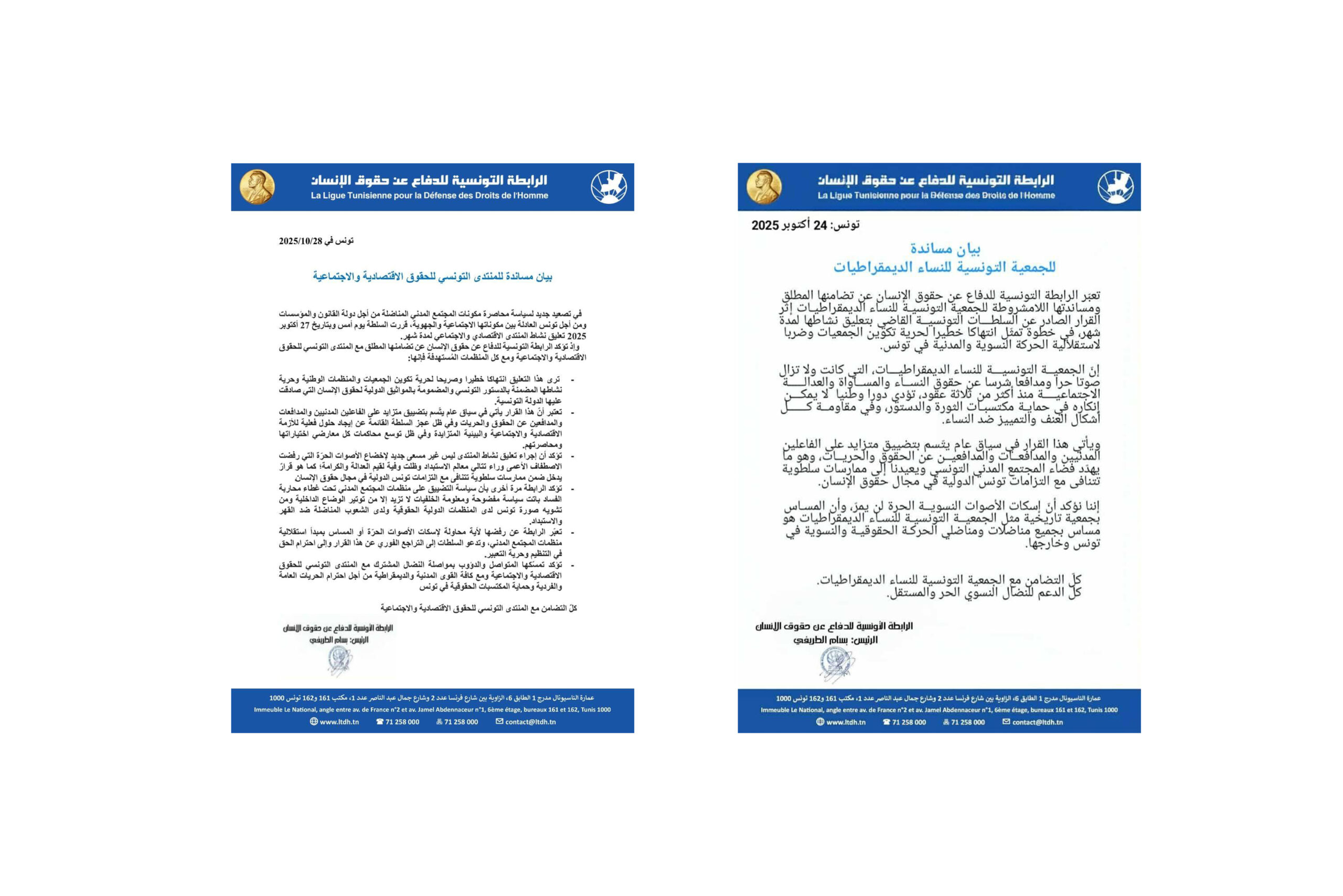 تعبّر الرابطة التونسية للدفاع عن حقوق الإنسان عن تضامنها المطلق ومساندتها اللامشروطة للجمعية التونسية للنساء الديمقراطيات إثر القرار الصادر عن السلطات التونسية القاضي بتعليق نشاطها لمدة شهر، في خطوة تمثّل انتهاكا خطيرا لحرية تكوين الجمعيات وضربا لاستقلالية الحركة النسوية والمدنية في تونس.