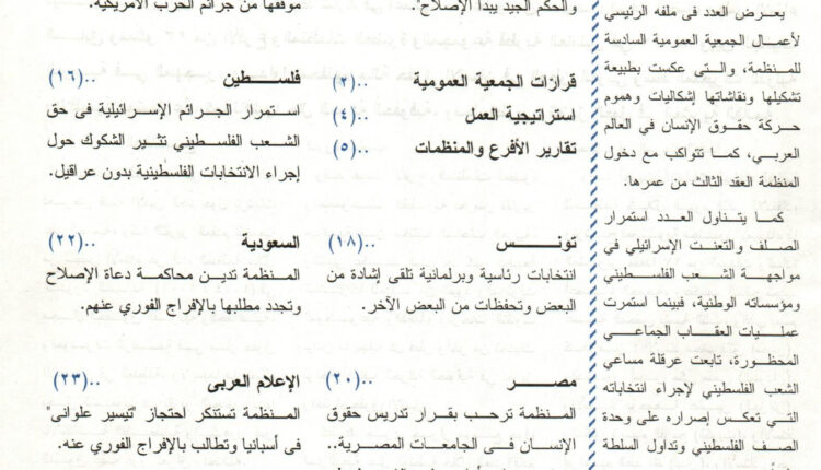 نشرة المنظمة العربية لحقوق الإنسان – نشرة غير دورية – العددان 197 – 198 اكتوبر/نوفمبر 2004 النشرة الاخبارية بواسطة المنظمة العربية لحقوق الإنسان آخر تحديث ديسمبر 10, 2024 0 287 شارك للاطلاع على النشرة بالكامل .. اضغط هنا المنظمة العربية لحقوق الإنسان 0 287 شارك FacebookTwitterWhatsAppالبريد الإلكترونيLinkedin